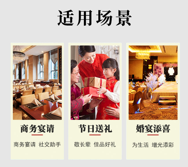 適飲場合:商務宴會、團圓小酌、婚慶宴席、節(jié)日送禮、收藏等