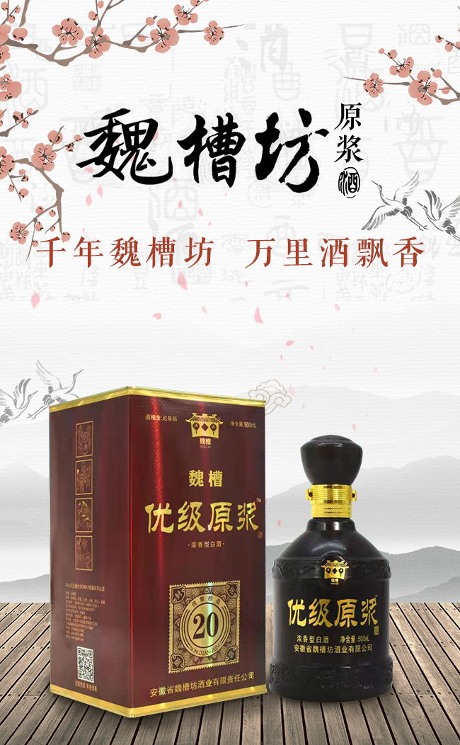 安徽魏槽坊酒業(yè)有限責(zé)任公司座落在華夏酒城安徽白酒之鄉(xiāng)——亳州市古井鎮(zhèn)。地處大京九鐵路沿線,自古以來,人杰地靈、物華天寶、資源豐富。公司釀造的白酒是通過“擇層取醅”、“擇時(shí)摘酒”等傳統(tǒng)技術(shù),得到精華的原漿美酒,再放入地下酒庫經(jīng)陶壇洞藏一定年限,使其自然老熟。