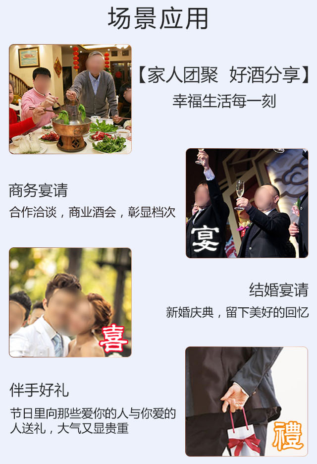 適飲場合:商務(wù)宴會、團(tuán)圓小酌、婚慶宴席、節(jié)日送禮、收藏