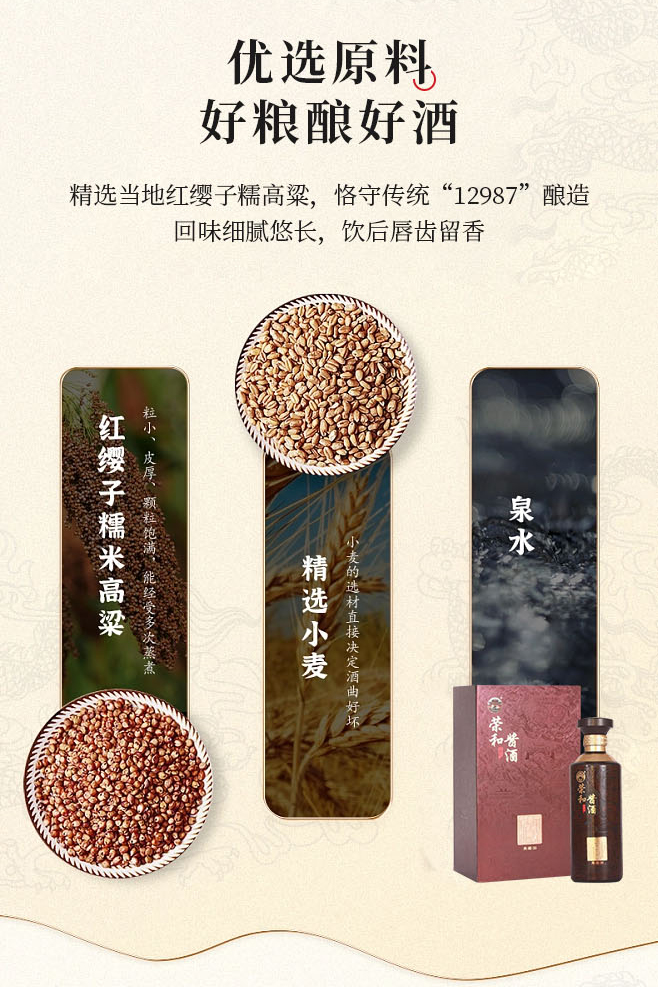 公司一貫高度重視質(zhì)量,堅(jiān)持走質(zhì)量效益型道路。由一大批長(zhǎng)期從事釀酒生產(chǎn)科研的專業(yè)技術(shù)人才嚴(yán)把質(zhì)量關(guān)。產(chǎn)品開(kāi)發(fā)已形成系列,先后研制開(kāi)發(fā)出了榮和醬酒系列、榮和經(jīng)典系列、榮和燒坊系列、百年榮和系列等酒。