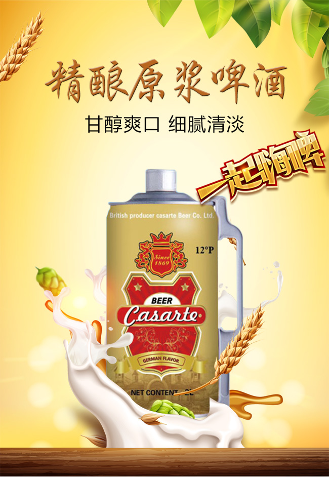 我公司精選優(yōu)級進口麥芽、啤酒花、優(yōu)級大米、上等酵母,采用優(yōu)級純凈水,超低溫長時間發(fā)酵,啤酒風味保鮮技術密閉隔氧,全過程純凈化釀造,使酒液清澈透明,純凈自然,口味清爽,更加適合消費者的消費需求。合理的保持了啤酒的各種營養(yǎng)成分,其色澤金黃透明,泡沫潔白細膩、掛杯持久、純爽柔和、麥香味濃郁。