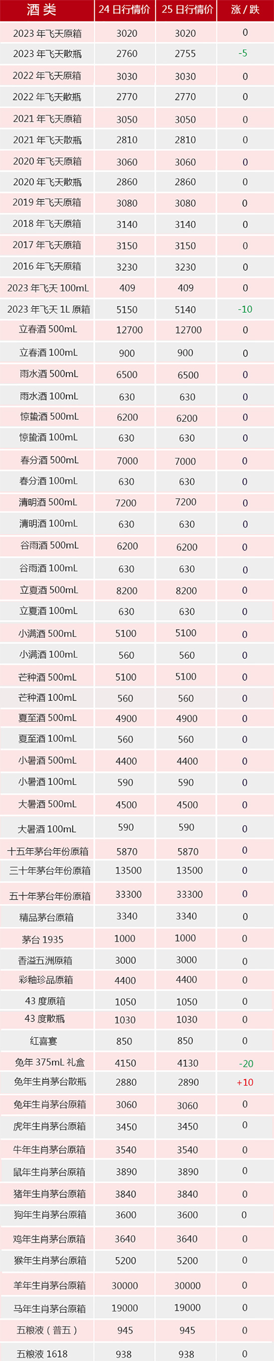 9月25日茅臺酒行情價。飛天方面,2023年散瓶跌5元/瓶,2023飛天1L原箱跌10元/瓶;生肖方面,兔年禮盒跌20元/瓶,兔年散瓶漲10元/瓶;其他系列無動價。