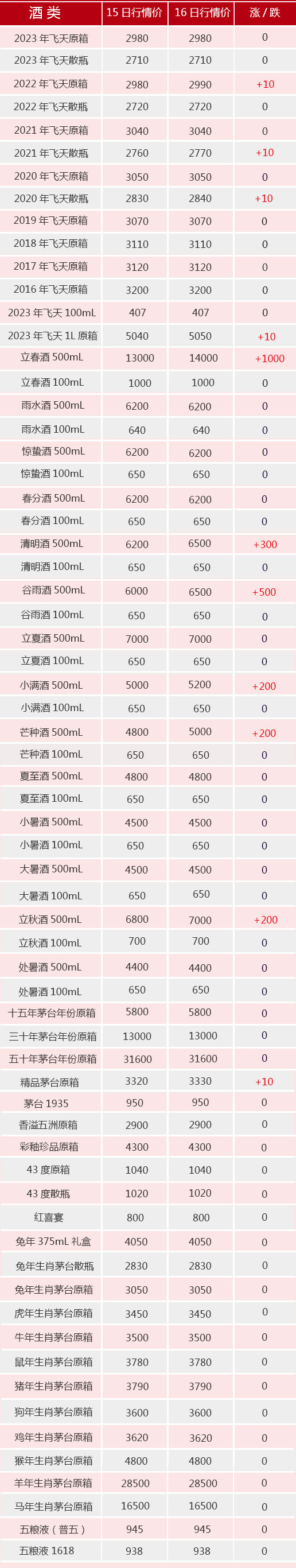 11月16日茅臺(tái)酒行情價(jià)。飛天方面,2021~2022散瓶、2022年散瓶和2023年1L原箱漲10元/瓶;生肖方面無(wú)動(dòng)價(jià);其他系列,大立春酒漲1000元/瓶,多款大節(jié)氣酒再漲200~500元/瓶。